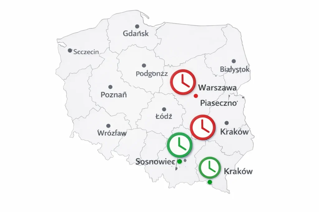 | Kraków | ok. 23 dni | kancelariafurtak.pl, dane za 2025 r. (akt. 08.01.2026) |